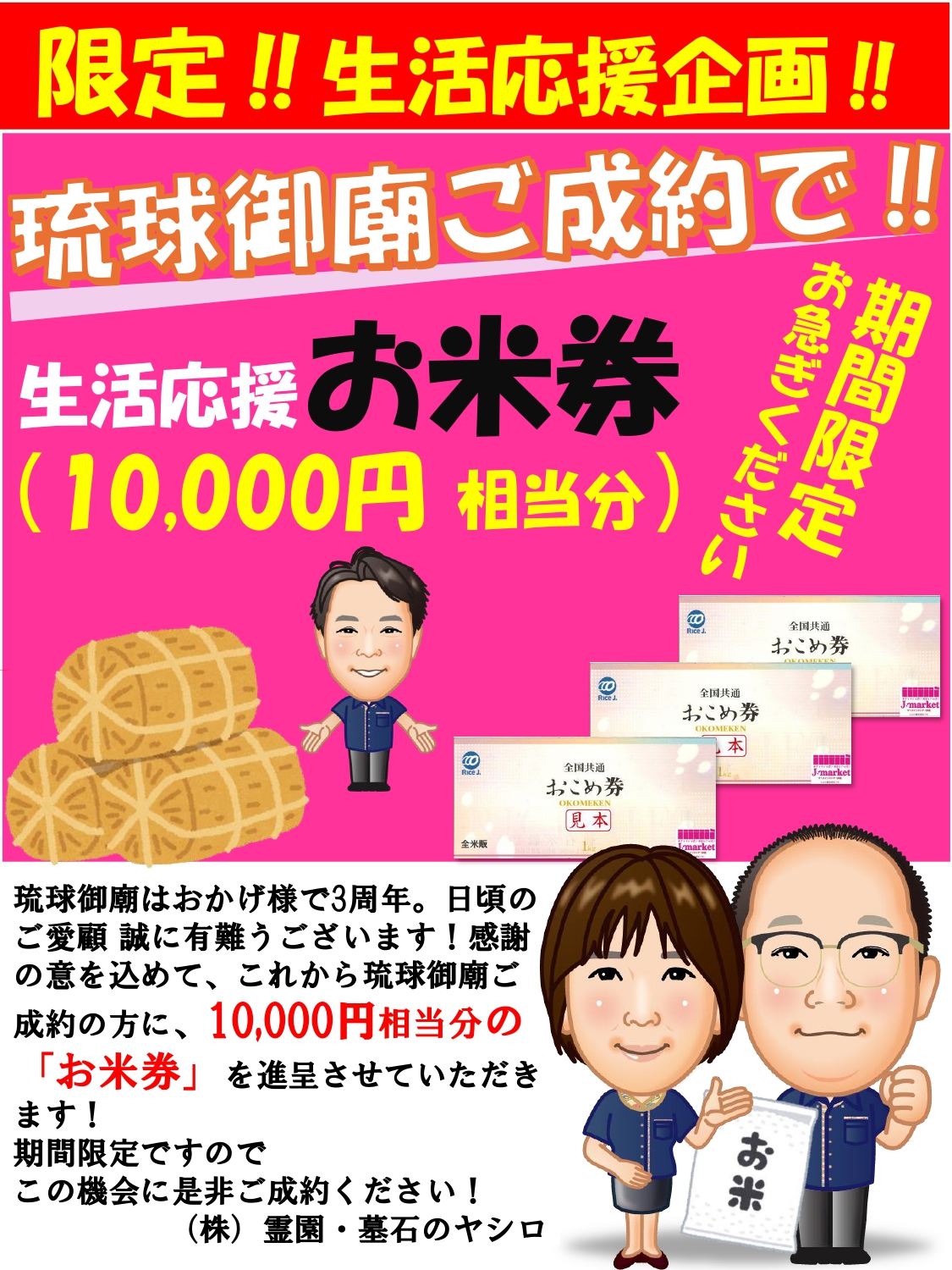 月内でご成約いただいた方にその場で お米券10,000円分 を贈呈いたします。 今年はユンヂチです。お墓の事でわからないことや、お悩みがありましたらまずはご相談だけでも承りますので、まずはご連絡ください。 フリーダイヤル 0120-846-940 0 ポスト LINEで送る 前のページへ 次のページへ